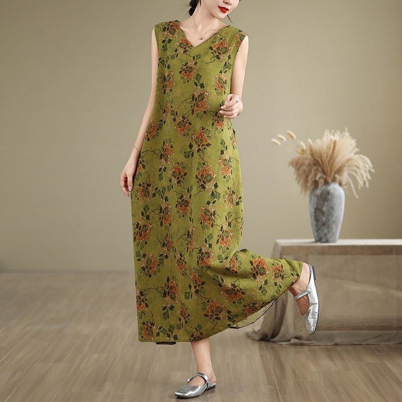 Maven Lin 极简高支100%亚麻V领挂脖连衣裙女度假风无袖背心长裙