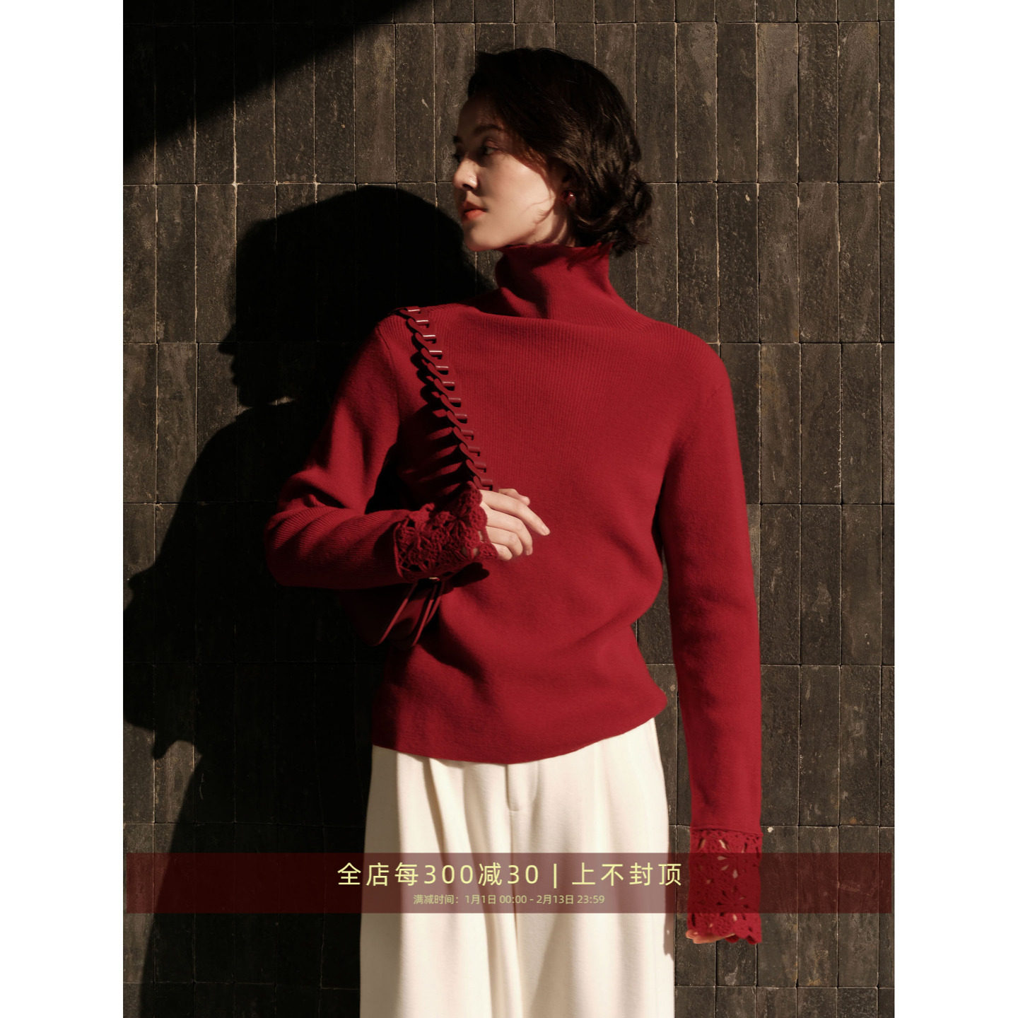 芝美日禾 片刻定格 100%绵羊毛高领镂空花纹打底衫套头针织毛衣