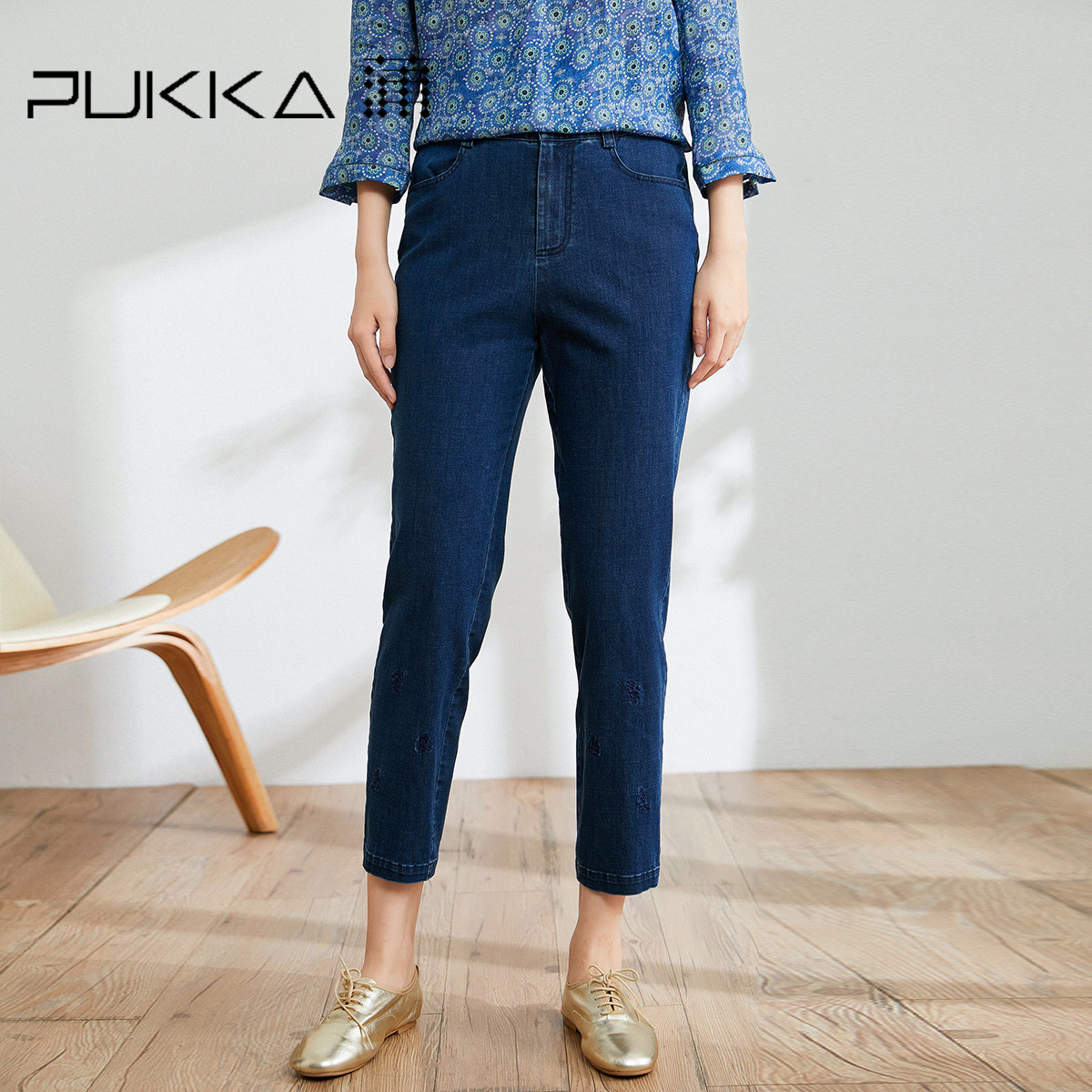 - 孔雀花九分裤女牛仔