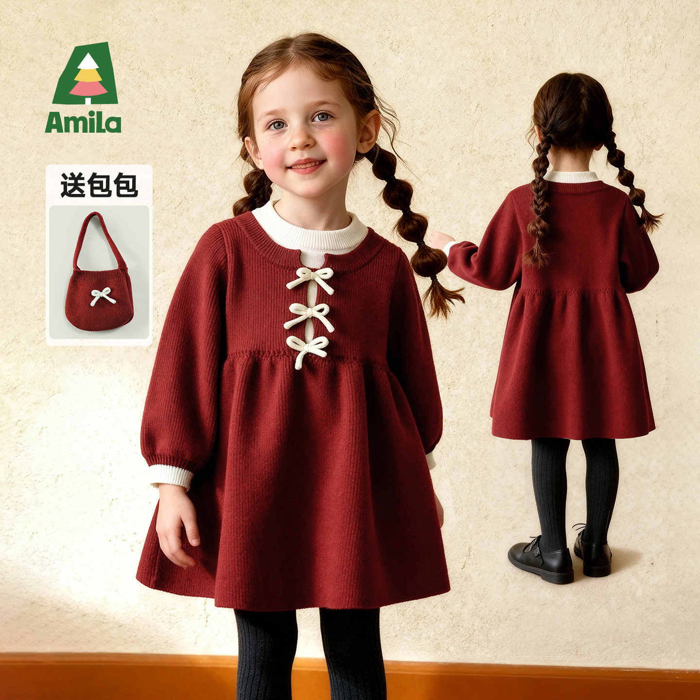 Amila女童针织连衣裙秋冬款儿童宝宝红色毛衣公主裙小女孩拜年服