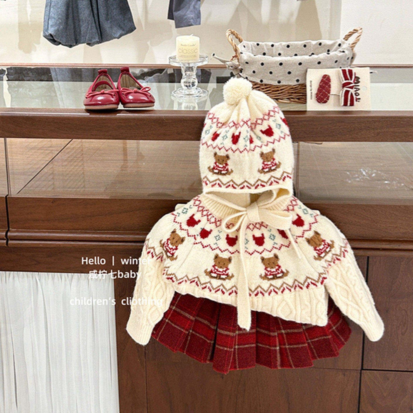 女童新年款小熊毛衣秋冬2025新款小女孩红色保暖儿童针织衫套装裙