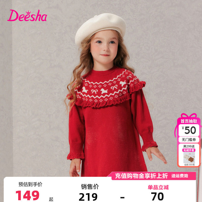 笛莎童装女童针织裙冬季新款儿童女孩宝宝毛衣裙红色新年服连衣裙