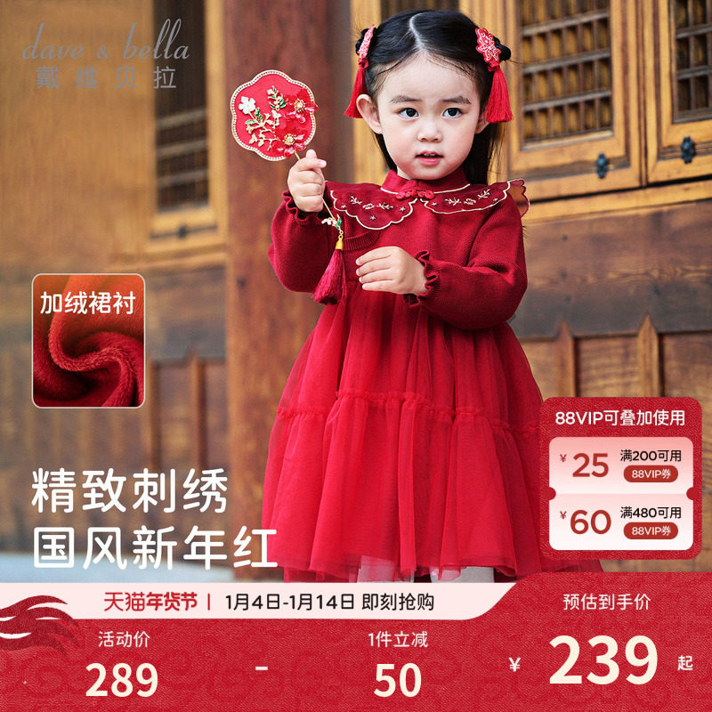 戴维贝拉女童连衣裙女童新款中国风针织裙子女宝礼服公主裙新年裙
