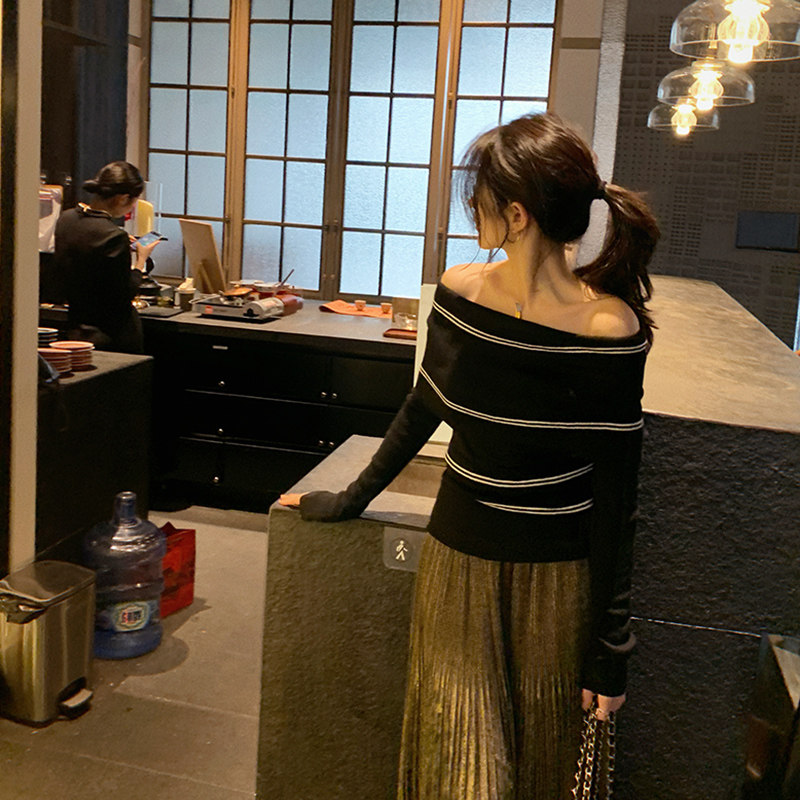 bigyu 一字领露肩条纹针织衫~春秋女新款长袖气质修身薄毛衣上衣