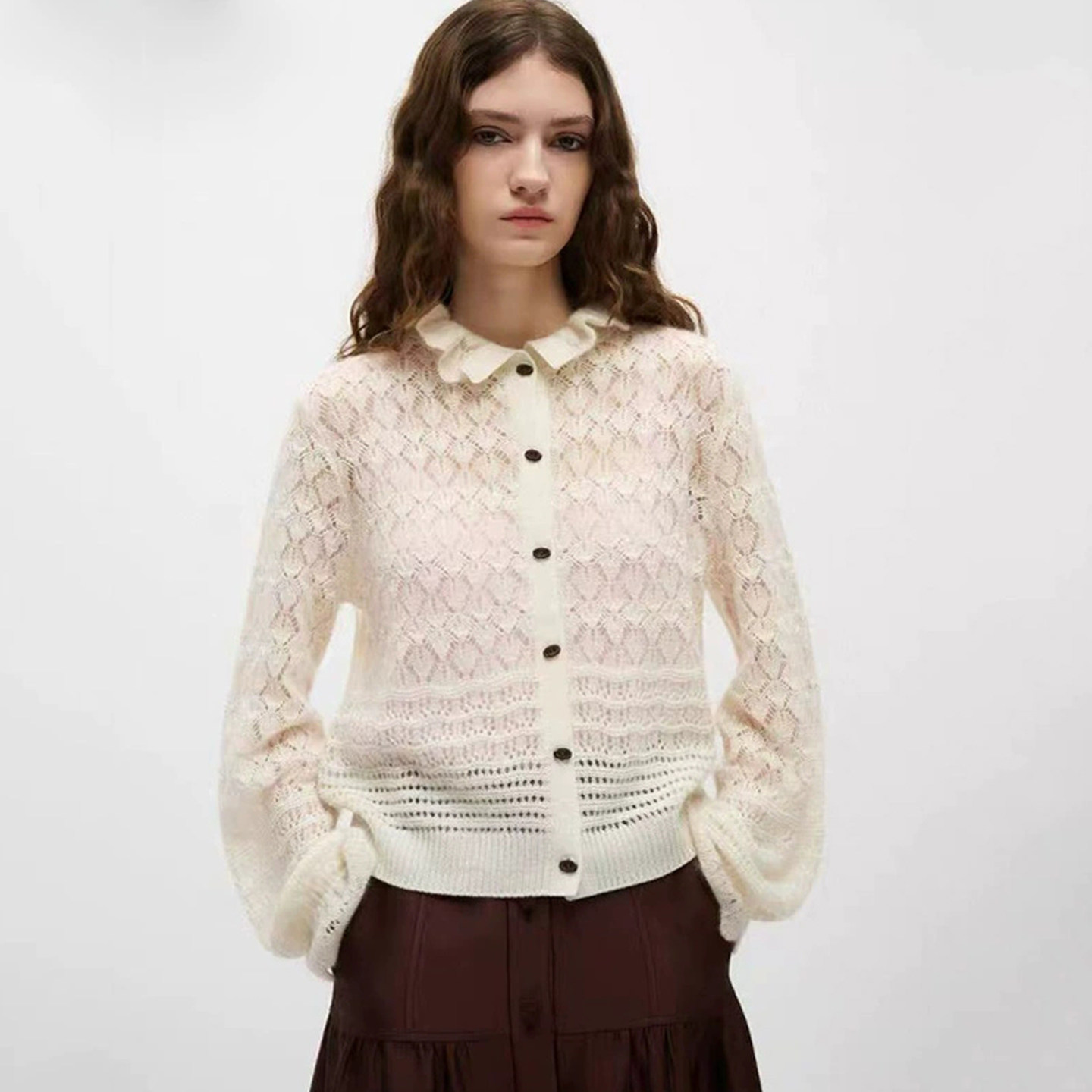 法式甜美~温柔气质小香风纯羊毛镂空春秋长袖薄毛衣针织开衫上衣