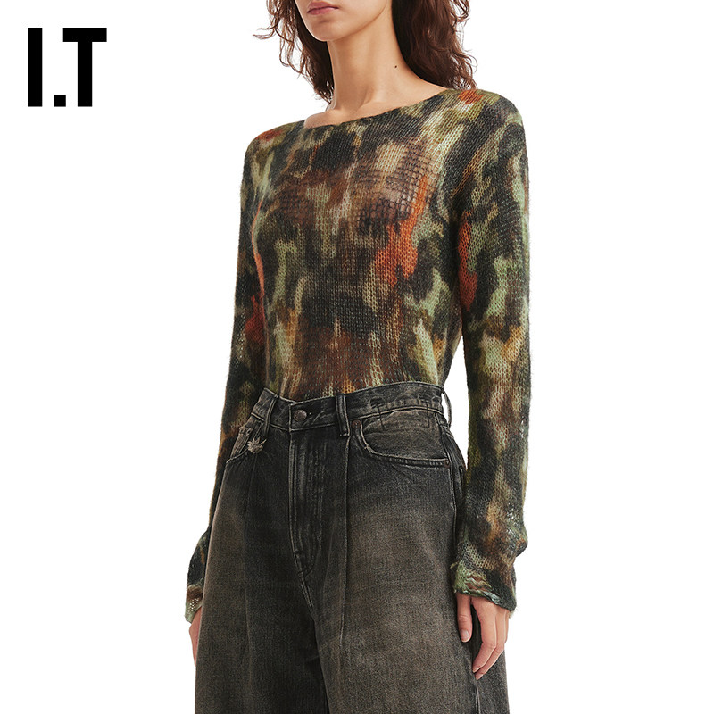 IT R13女装破坏感破洞针织衫新款时髦街头迷彩晕色薄毛衣WY212YXP