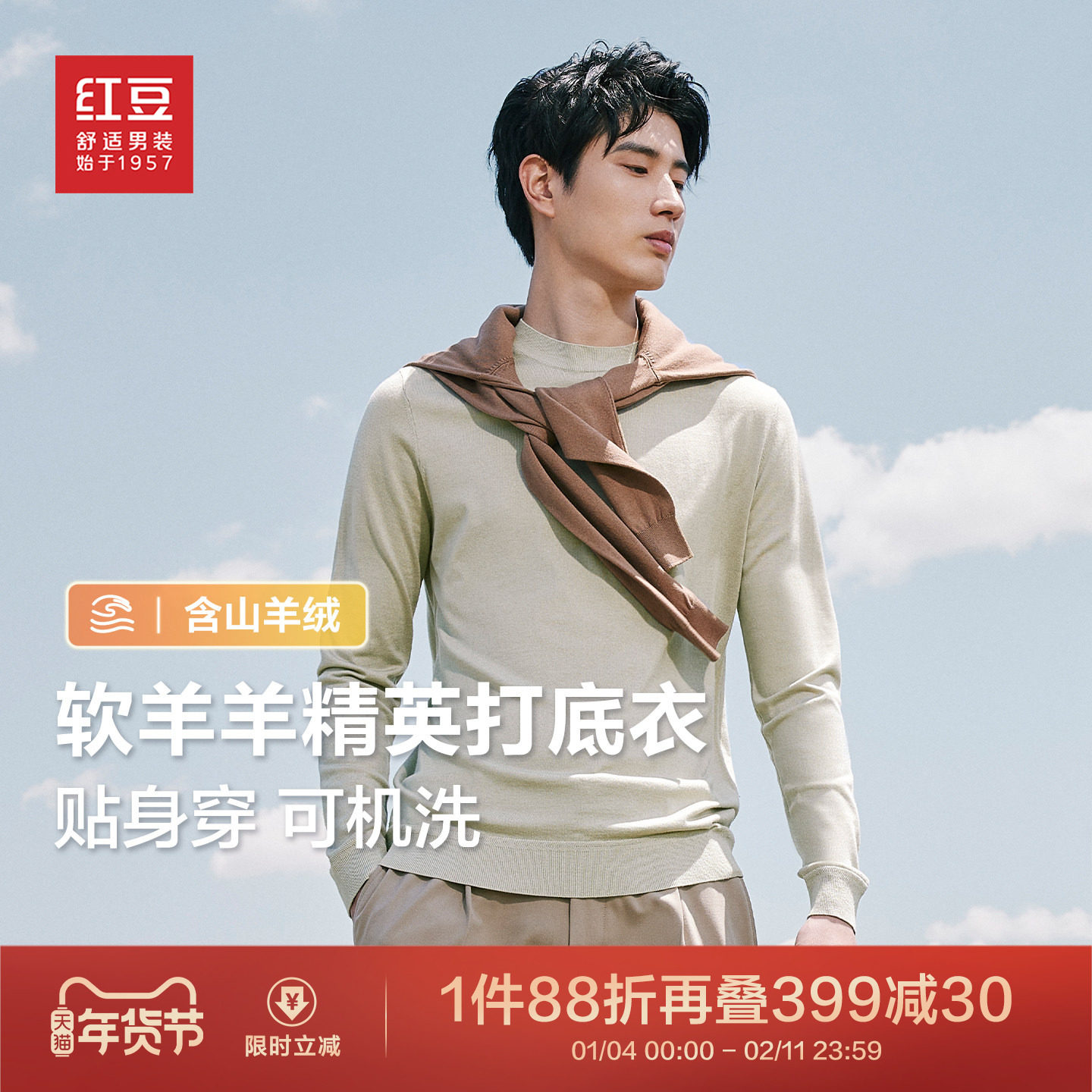【含羊绒】红豆长袖圆领针织T恤衫男秋季新款薄毛衣贴身穿毛衫预