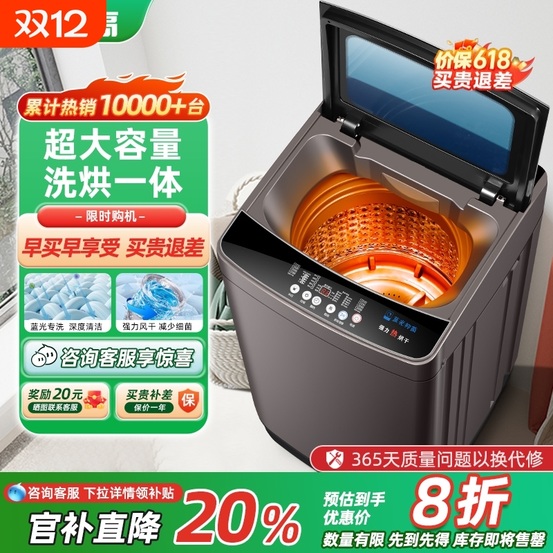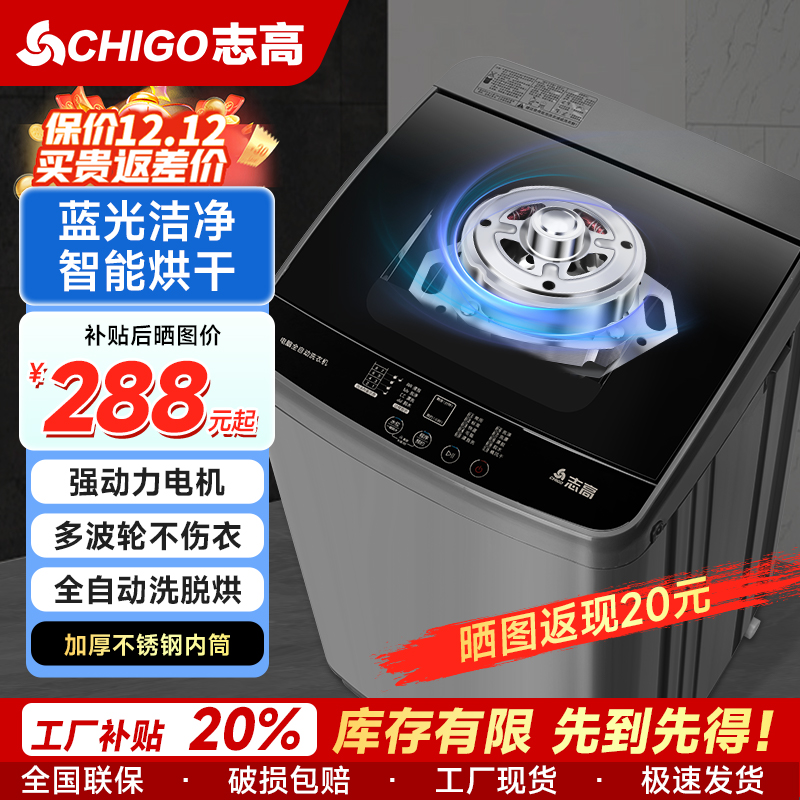 志高12公斤洗衣机全自动家用小型出租房宿舍用波轮洗烘一体热风干