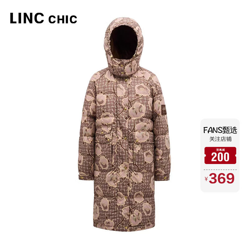 LINCCHIC金羽杰羽绒服复古印花中长款羽绒服女直筒连帽羽绒服外套