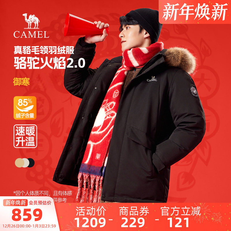 骆驼男装中长款羽绒服男黑色秋冬白鸭绒宽松加厚保暖连帽毛领外套
