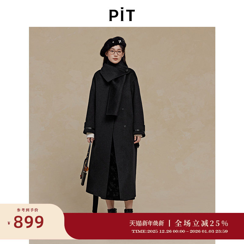 PIT100%绵羊毛呢外套女2025冬季新款长款大衣黑色百搭显瘦