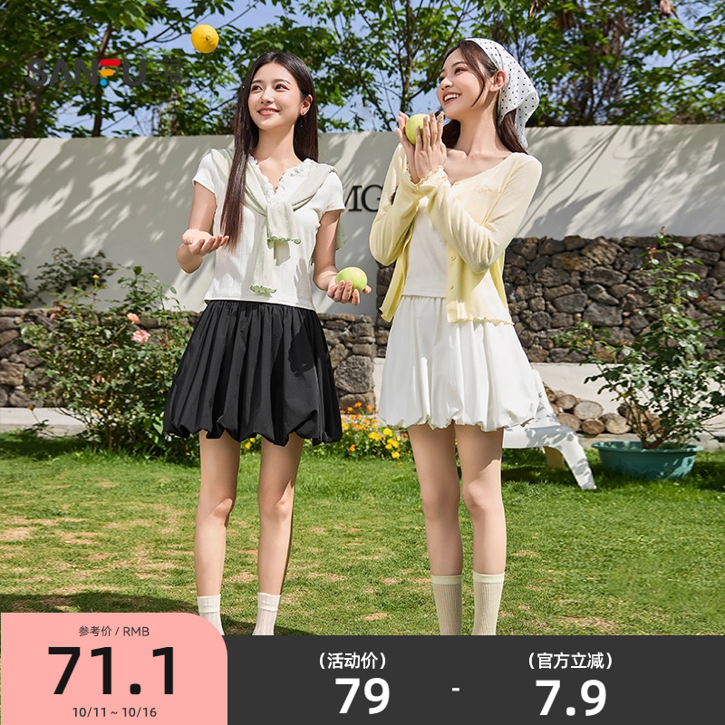 三福短裙2025新款夏季甜美白色花苞摆宽松蓬蓬半身裙子女装498364