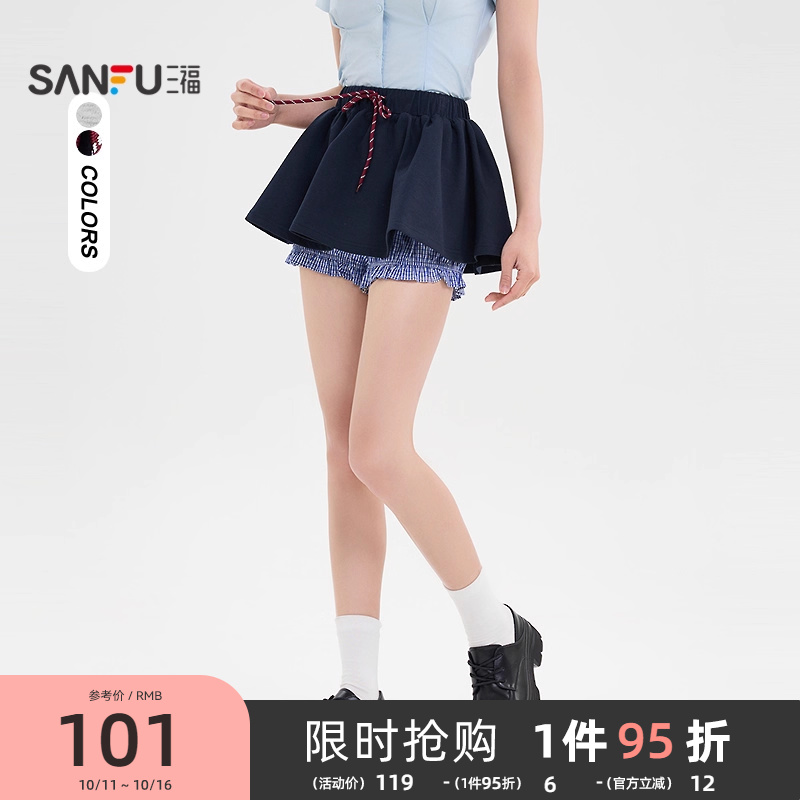 三福短裙2025新款夏季撞色花边针织蓬蓬裙小个子半身裙女装500286