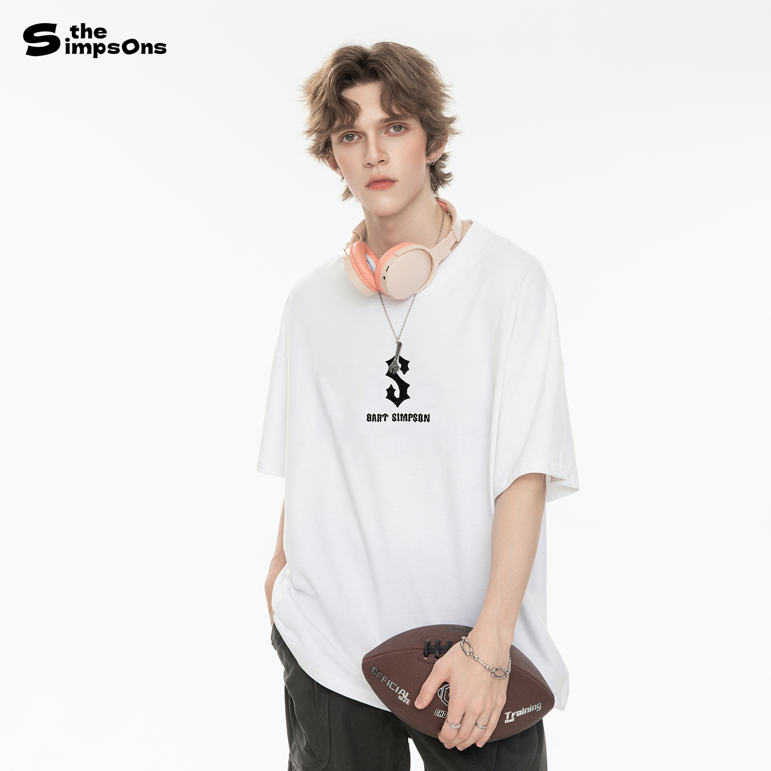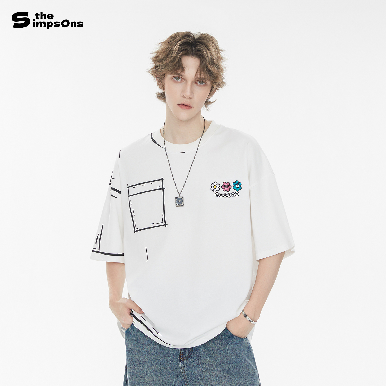 辛普森一家 美式卡通涂鸦线条图案字母印花纯棉百搭圆领短袖T恤
