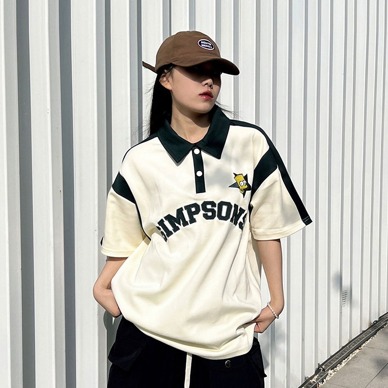 辛普森一家短袖polo衫夏季女字母星星刺绣撞色拼接翻领情侣衣服男