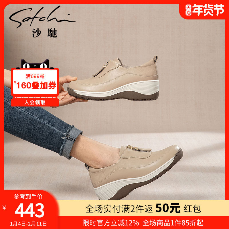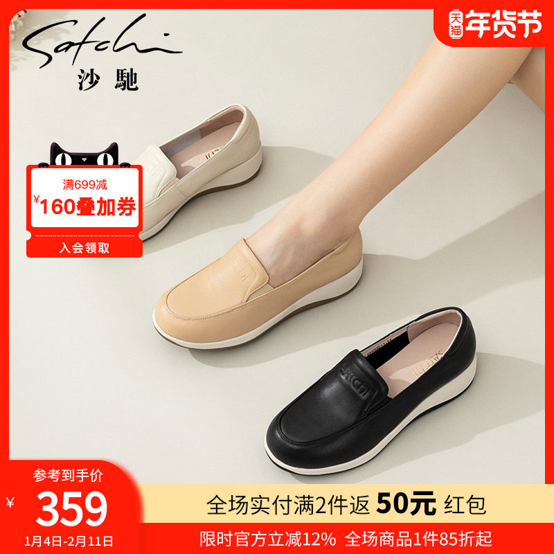 沙驰女鞋坡跟厚底乐福鞋中老年妈妈鞋2026春季新款休闲深口单鞋女
