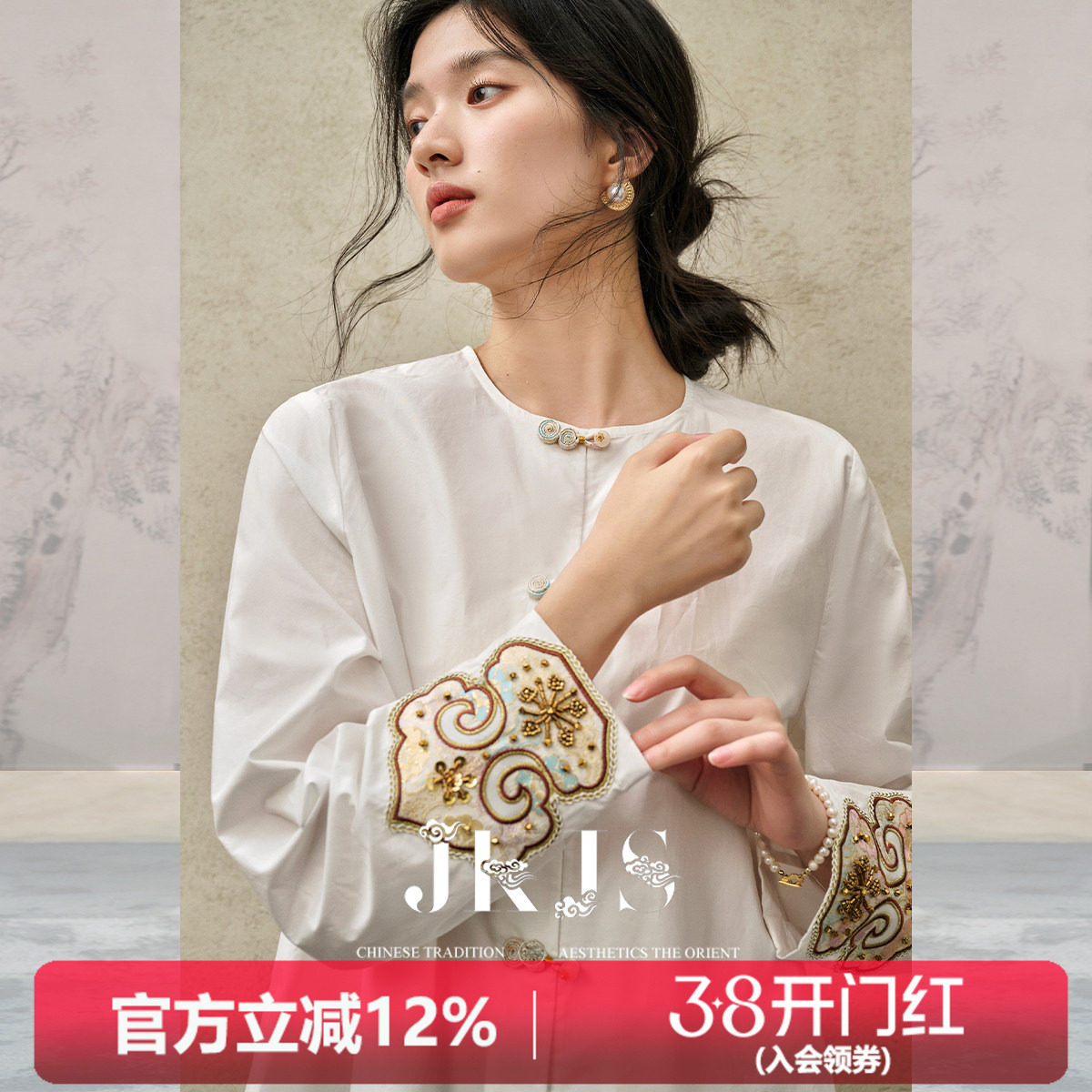 JKJS【清韵欢】棉衬衫新中式穿搭白色衬衣刺绣上衣国风盘扣上衣