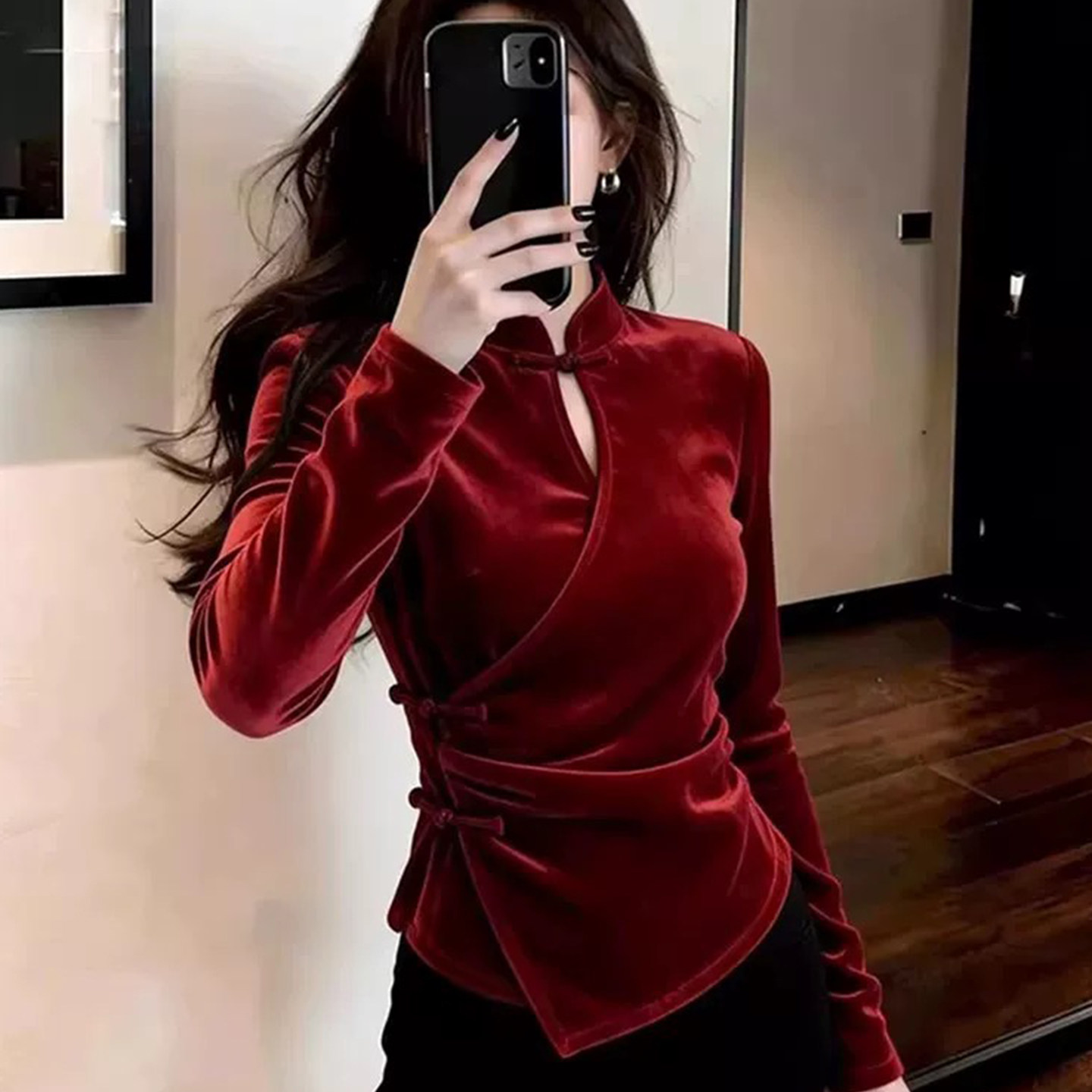 红色金丝绒打底衫女新年本命年内搭秋冬遮肚复古中式国风盘扣上衣