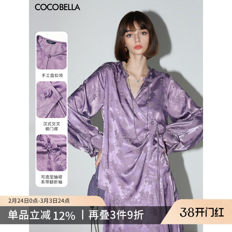 COCOBELLA新中式暗纹提花缎面衬衫女国风偏门襟盘扣上衣SR3061B-2