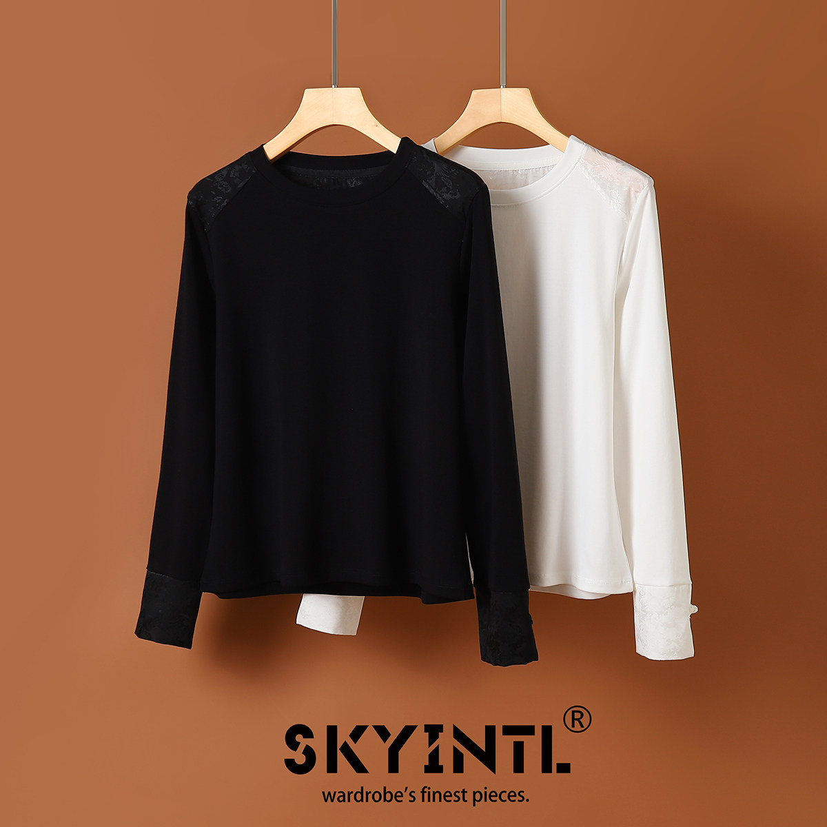 SKYINTL春季新款设计感长袖T恤女薄款拼接缎面提花新中式盘扣上衣