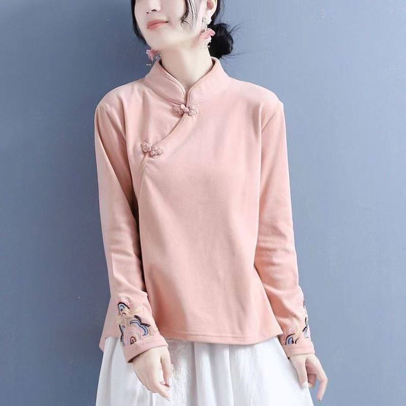 双面德绒加厚打底衫女秋冬新款刺绣立领盘扣上衣中国风茶服衬衫女