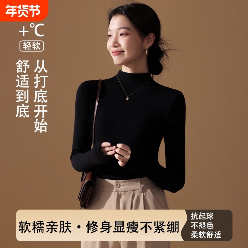 黑色莫代尔半高领打底衫女内搭秋冬新款紧身洋气加绒加厚长袖上衣