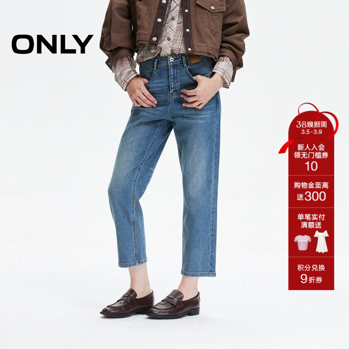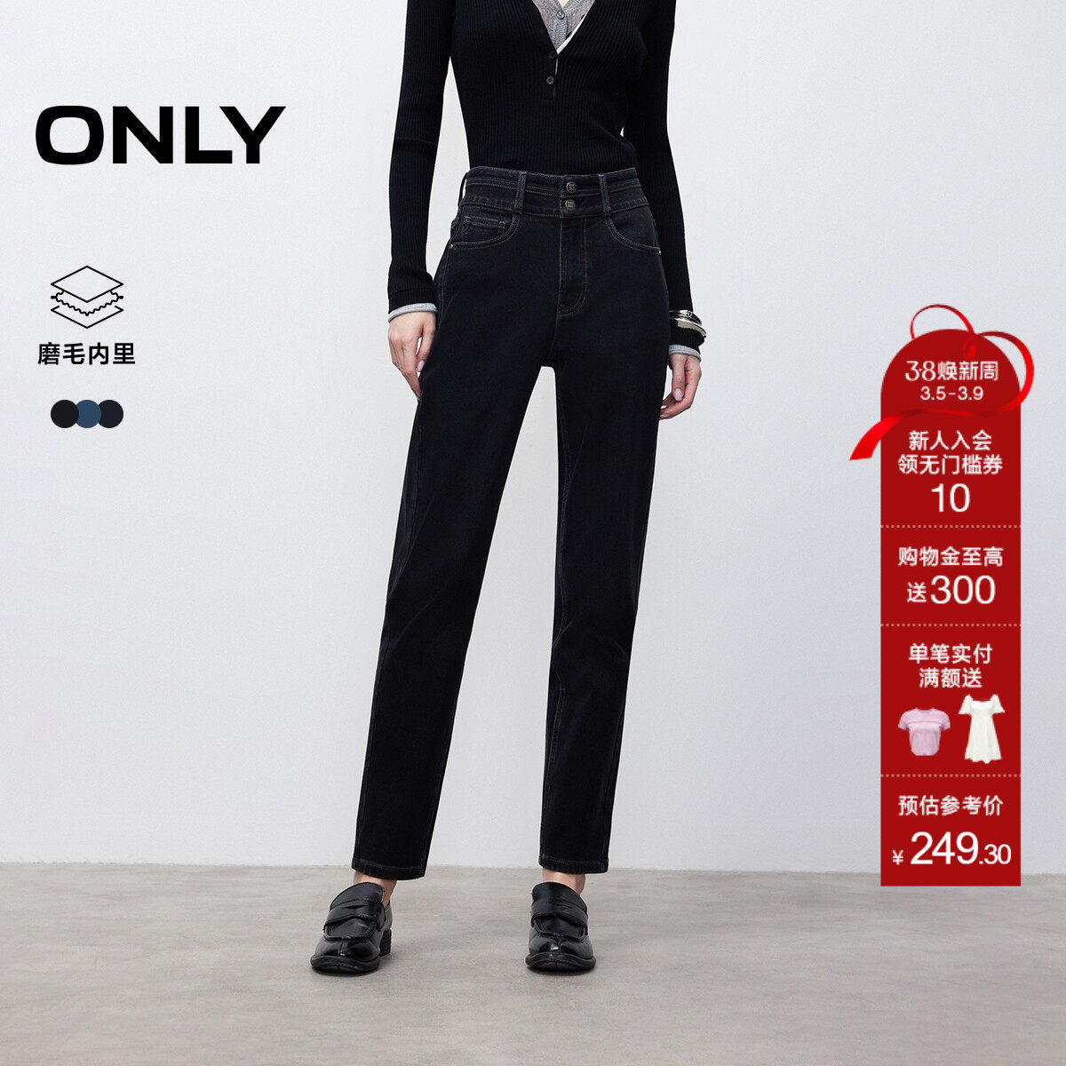 ONLY春季潮流磨毛保暖内里高腰两粒扣修身直筒九分裤牛仔裤女