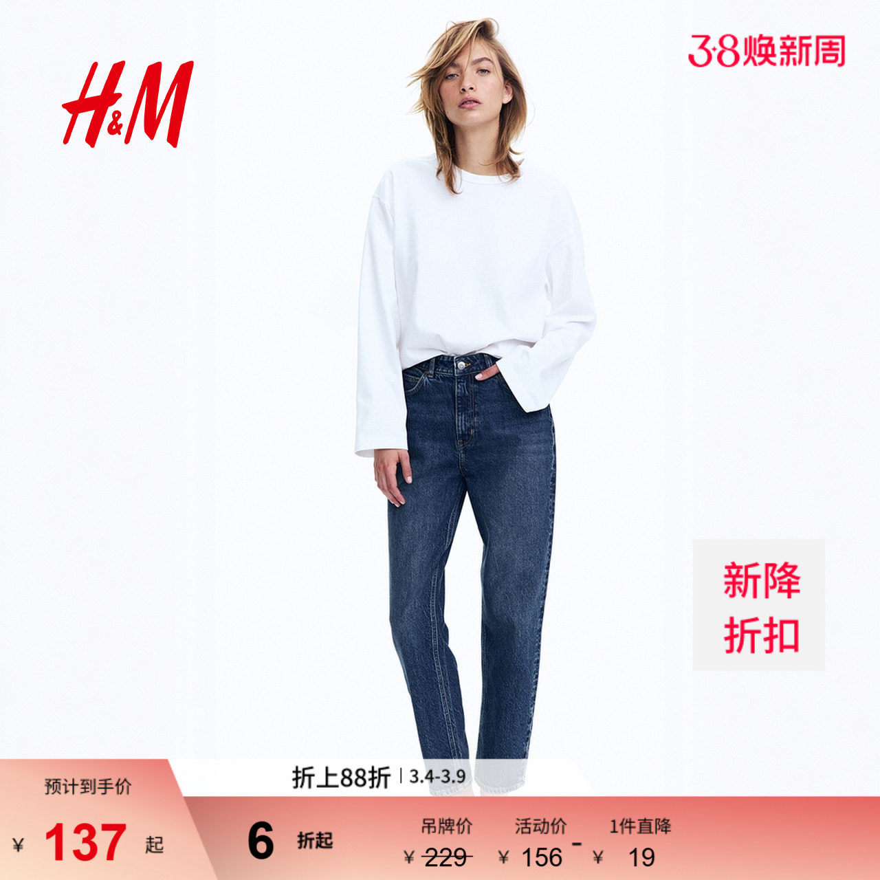 HM女装牛仔裤春季修身版型法棍牛仔裤高腰微弹通勤九分裤0941666