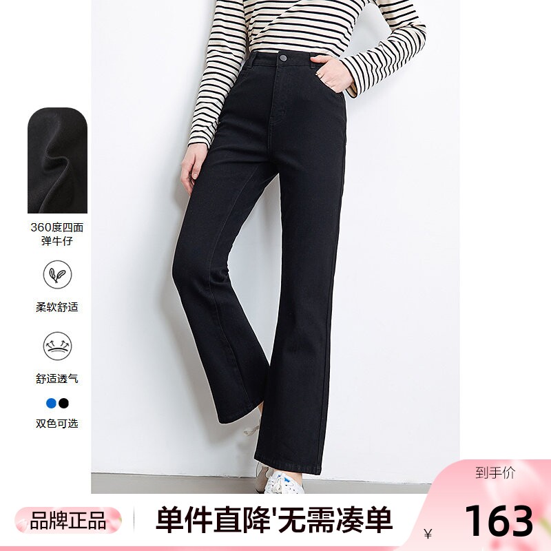 150小个子八九分百搭微喇叭牛仔裤女2026春秋薄绒高腰修身显瘦黑