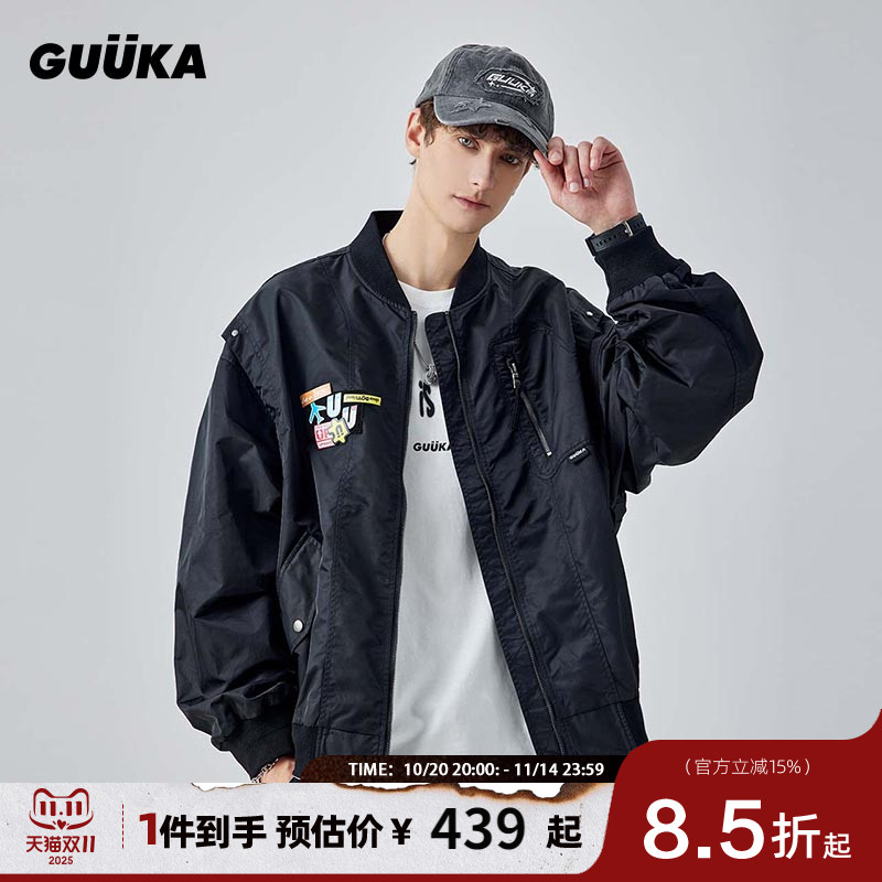 【防水尼龙】GUUKA黑色短款飞行员夹克男 情侣绣花棒球服秋季外套