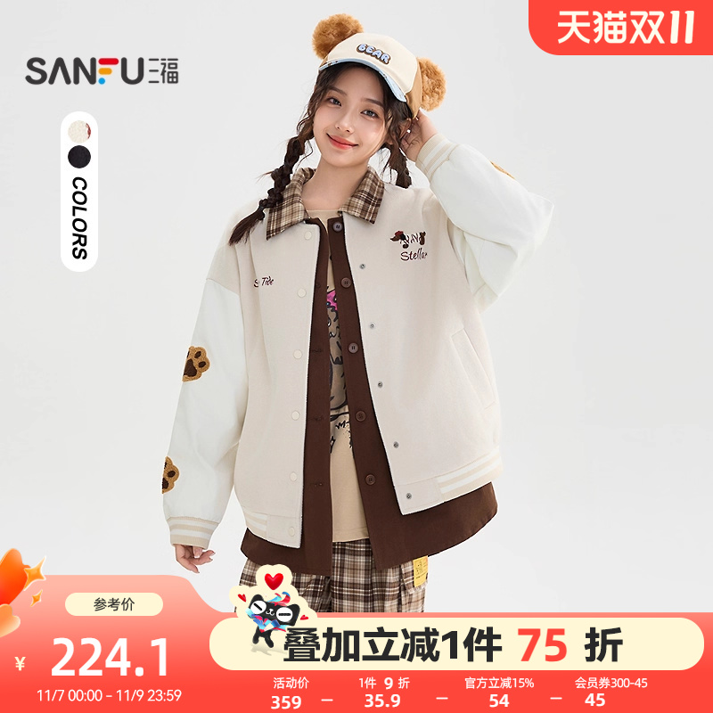 三福外套女2025新款冬季小狗绣花拼接皮质袖棒球服上衣女装509958