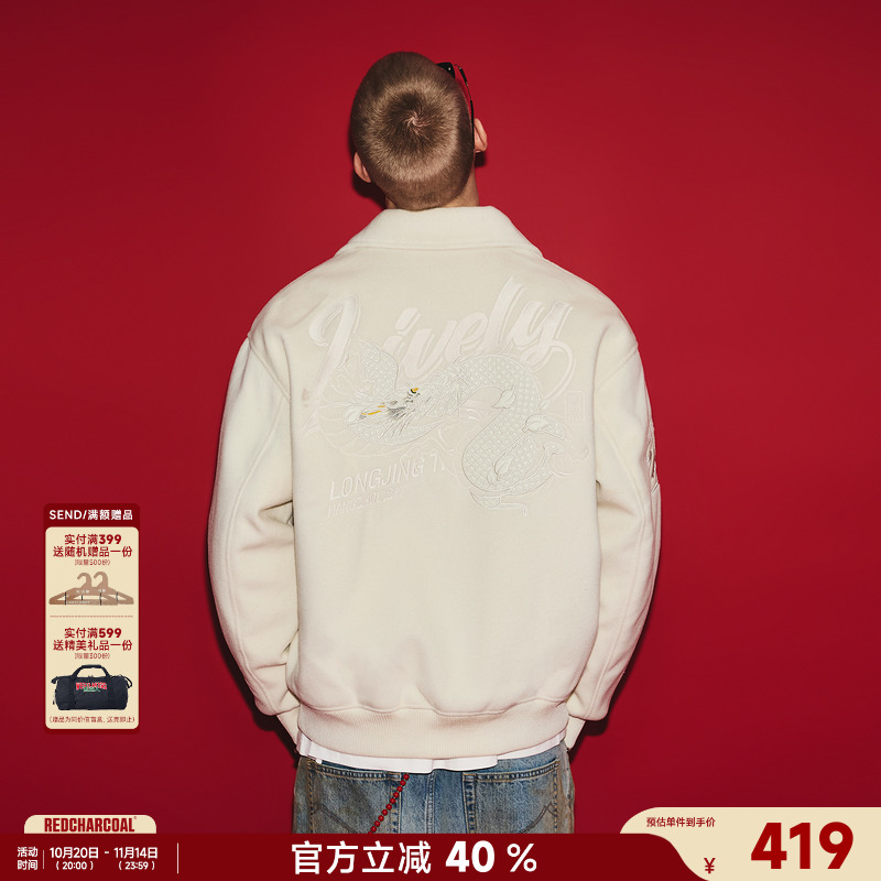 REDCHARCOAL红炭白色绣花棒球服夹克男美式潮牌毛呢外套保暖棉衣