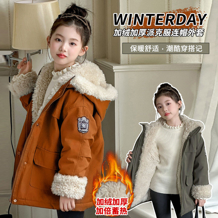 女童中长款加绒加厚派克服冬款外套2025新款儿童时尚大衣毛领风衣