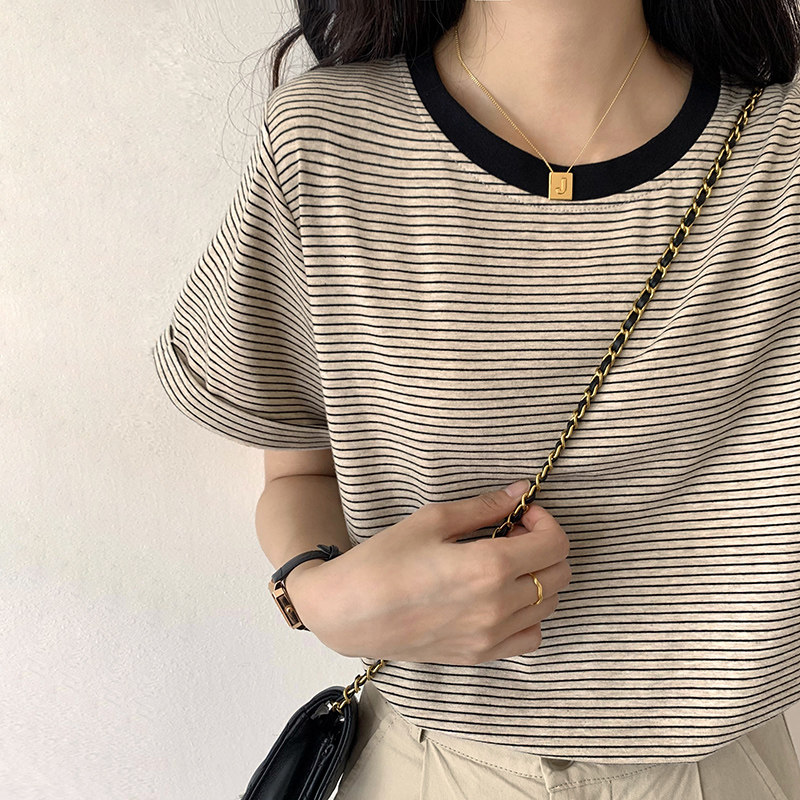 韩版复古条纹圆领短袖t恤女宽松显瘦内搭打底衫上衣夏季新款学生