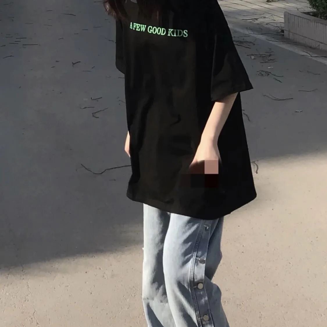chic港味印花黑色t恤女短袖宽松韩版潮ins显瘦百搭纯棉学生半截袖