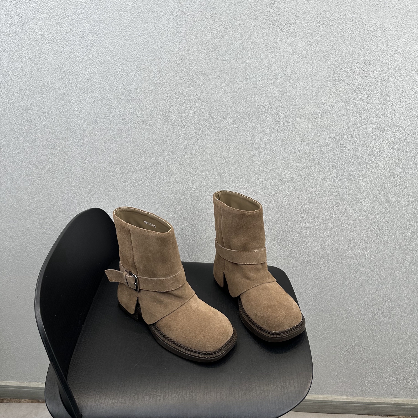 2025新款时尚百搭圆头中跟舒适女鞋真皮套筒短靴英伦风骑士靴单靴