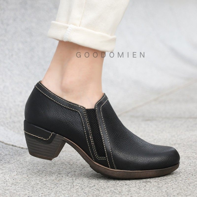 骆驼女鞋真皮软底舒适小皮鞋2025春季新款牛皮高跟鞋粗跟浅口单鞋