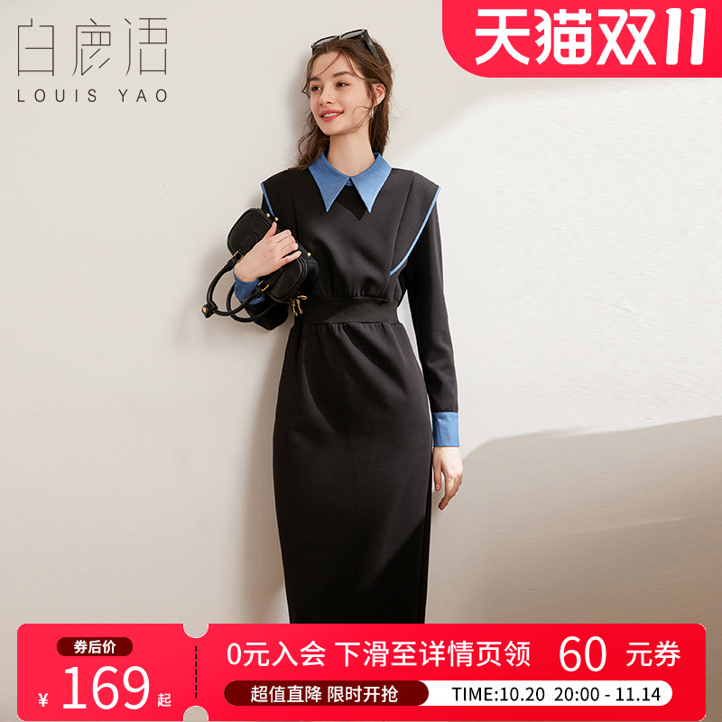 pusumede 黑色长袖针织连衣裙气质打底毛衣裙女拼接设计修身长裙