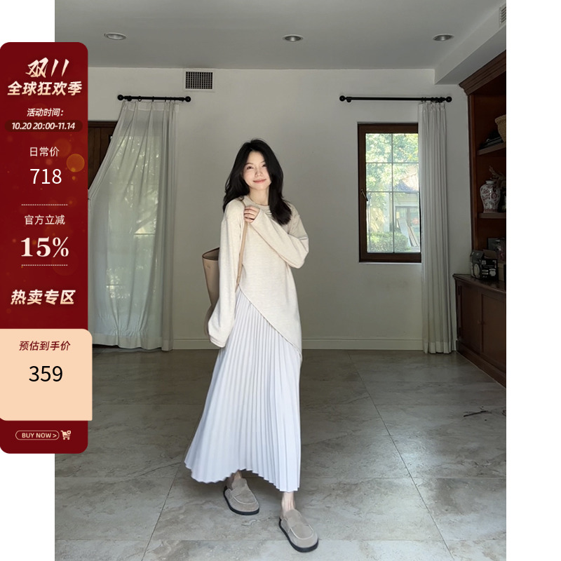 郭九九呢气质不规则设计感假两件宽松显瘦拼接压褶连衣裙秋季长裙