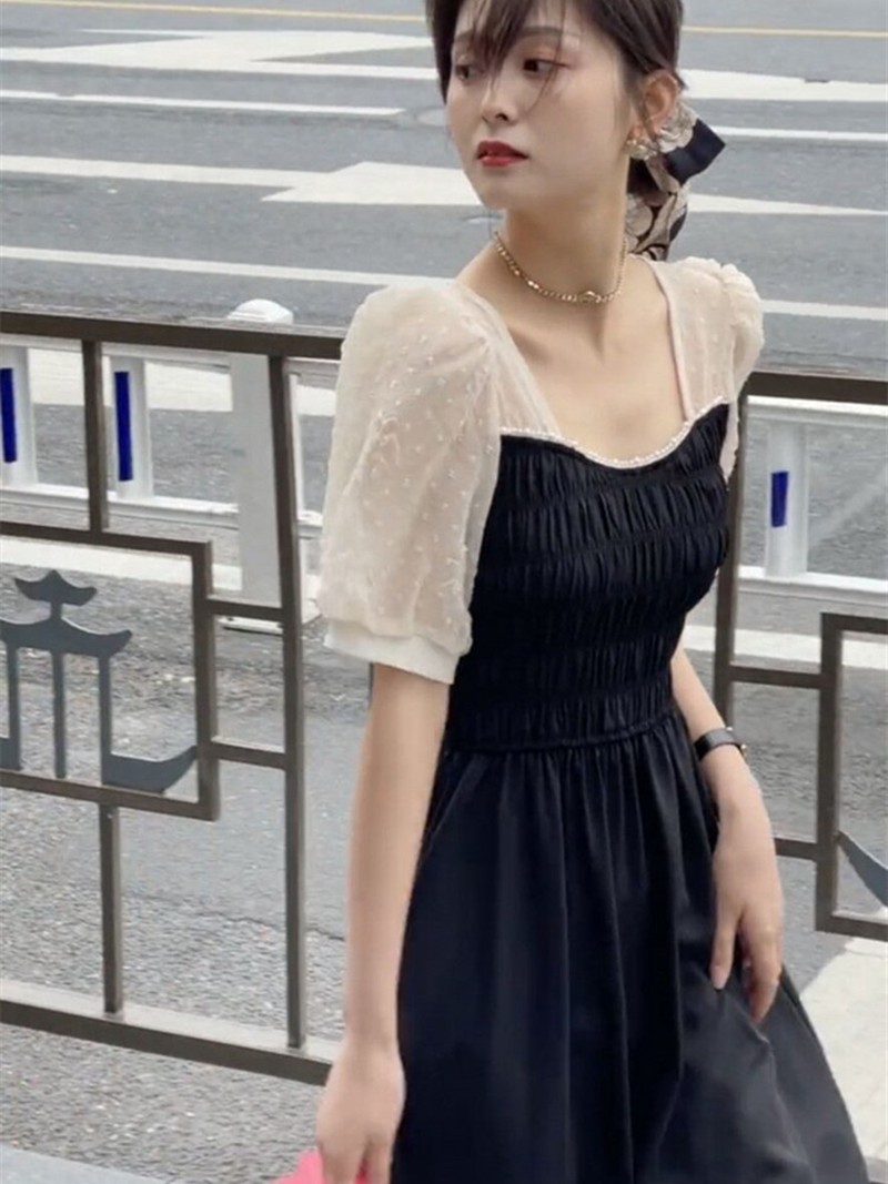 夏季女法式茶歇黑色拼接连衣裙长裙气质显瘦赫本风温柔风端庄大气