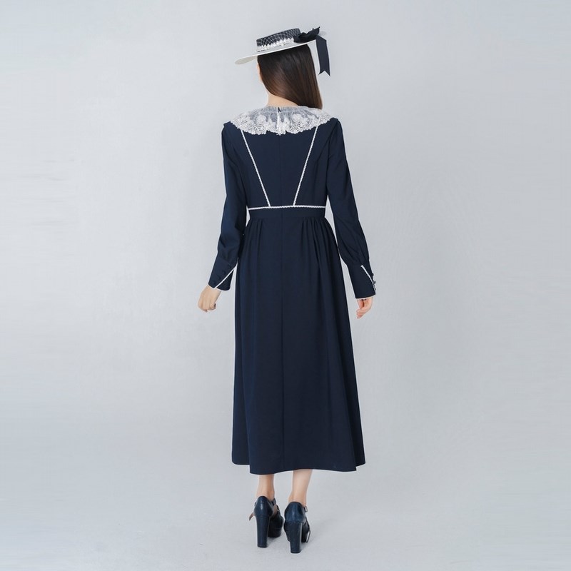 理想三旬女装复古欧式宫廷风巴伐利亚重工棉麻花边拼接连衣裙长裙