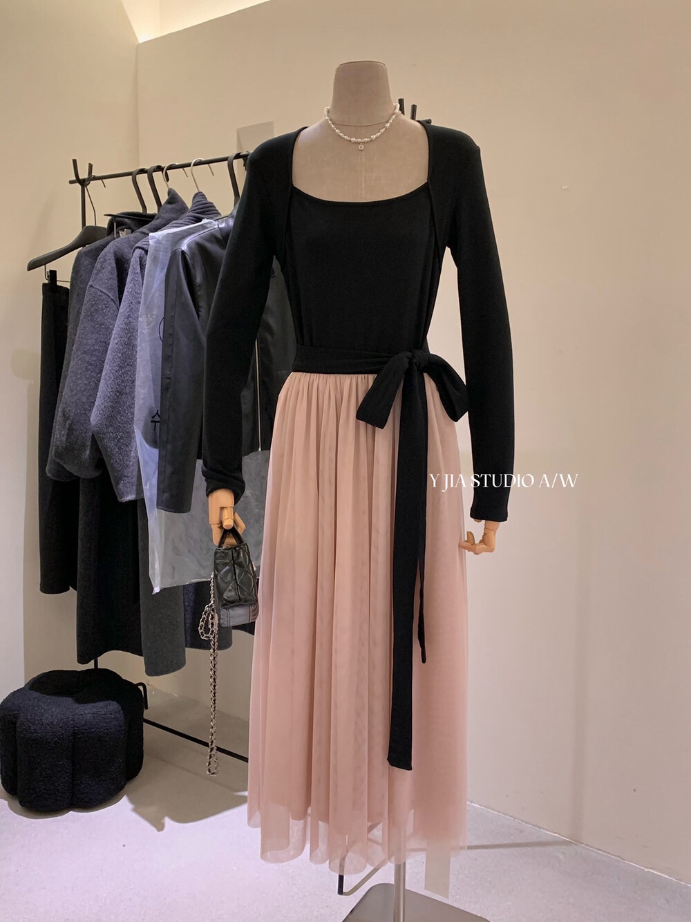 黑色长袖方领假两件挂脖连衣裙女高级感气质收腰长款针织拼接长裙