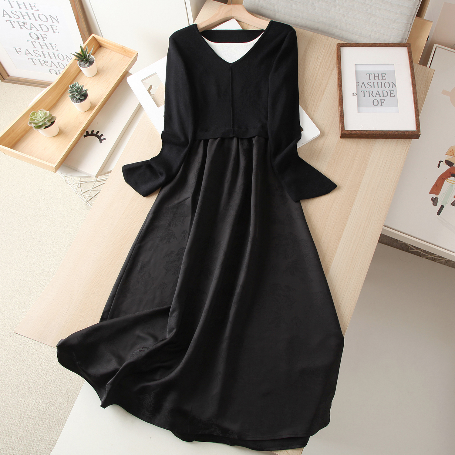 法式赫本小香风假两件拼接收腰气质长裙打底黑色针织连衣裙女秋冬