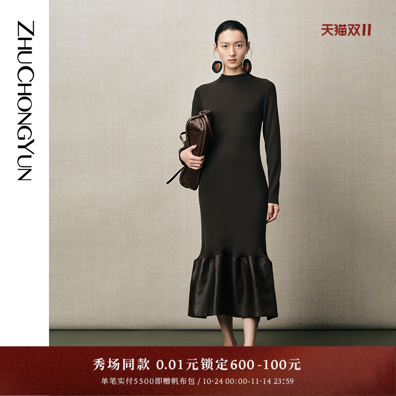 ZHUCHONGYUN2025冬新款东方修身拼接连衣裙长裙简约圆领针织裙子