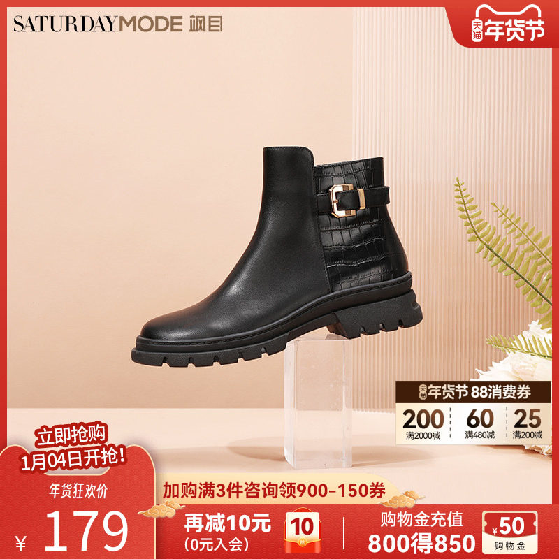 星期六厚底小短靴女冬季新款女真皮单靴春秋黑色英伦马丁切尔西靴