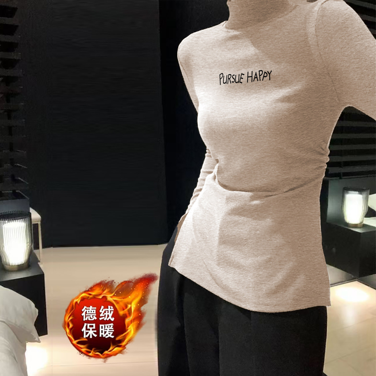 2025秋冬德绒保暖中长款t恤女遮屁股半高领长袖打底衫开叉上衣ins