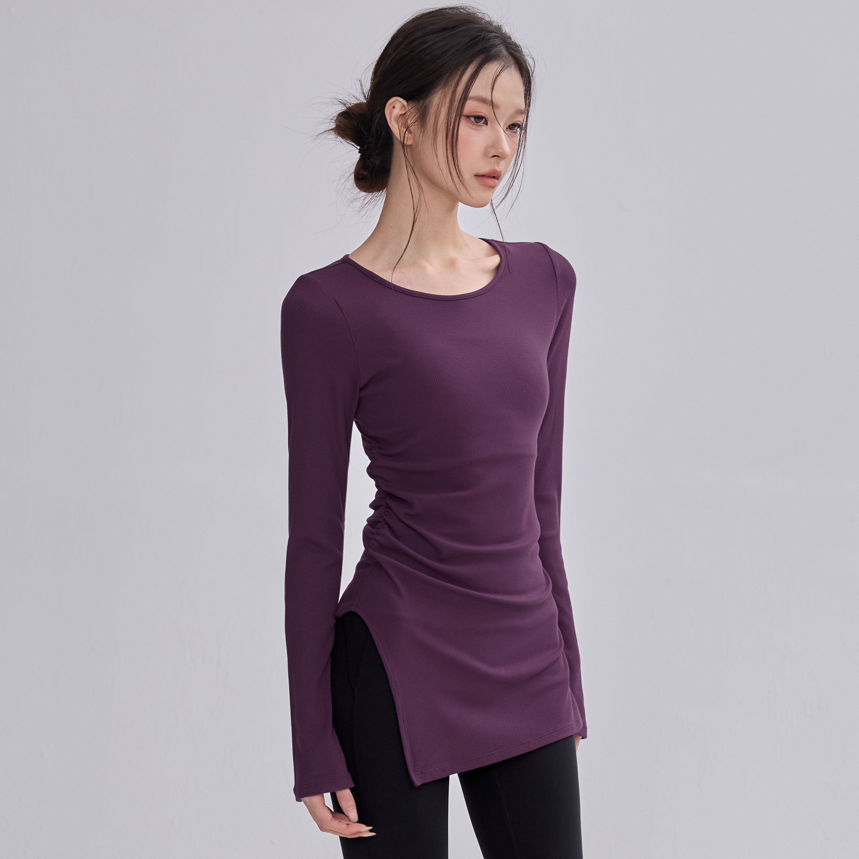 中长款开叉瑜伽服女紫色长袖健身T恤遮臀显瘦运动普拉提训练上衣