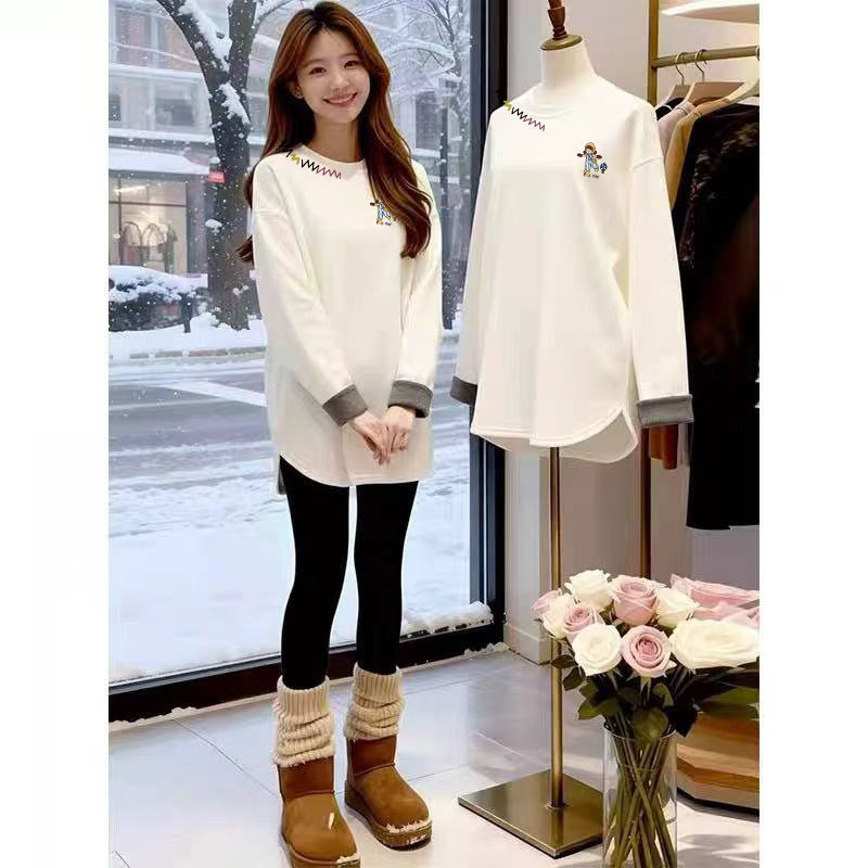 长袖t恤女中长款开叉磨毛秋冬纯棉宽松遮屁股配鲨鱼裤白色打底衫