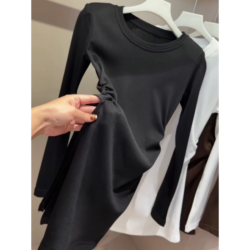 欧货中长款不规则开叉长袖T恤女冬季新款褶皱收腰修身磨毛打底衫