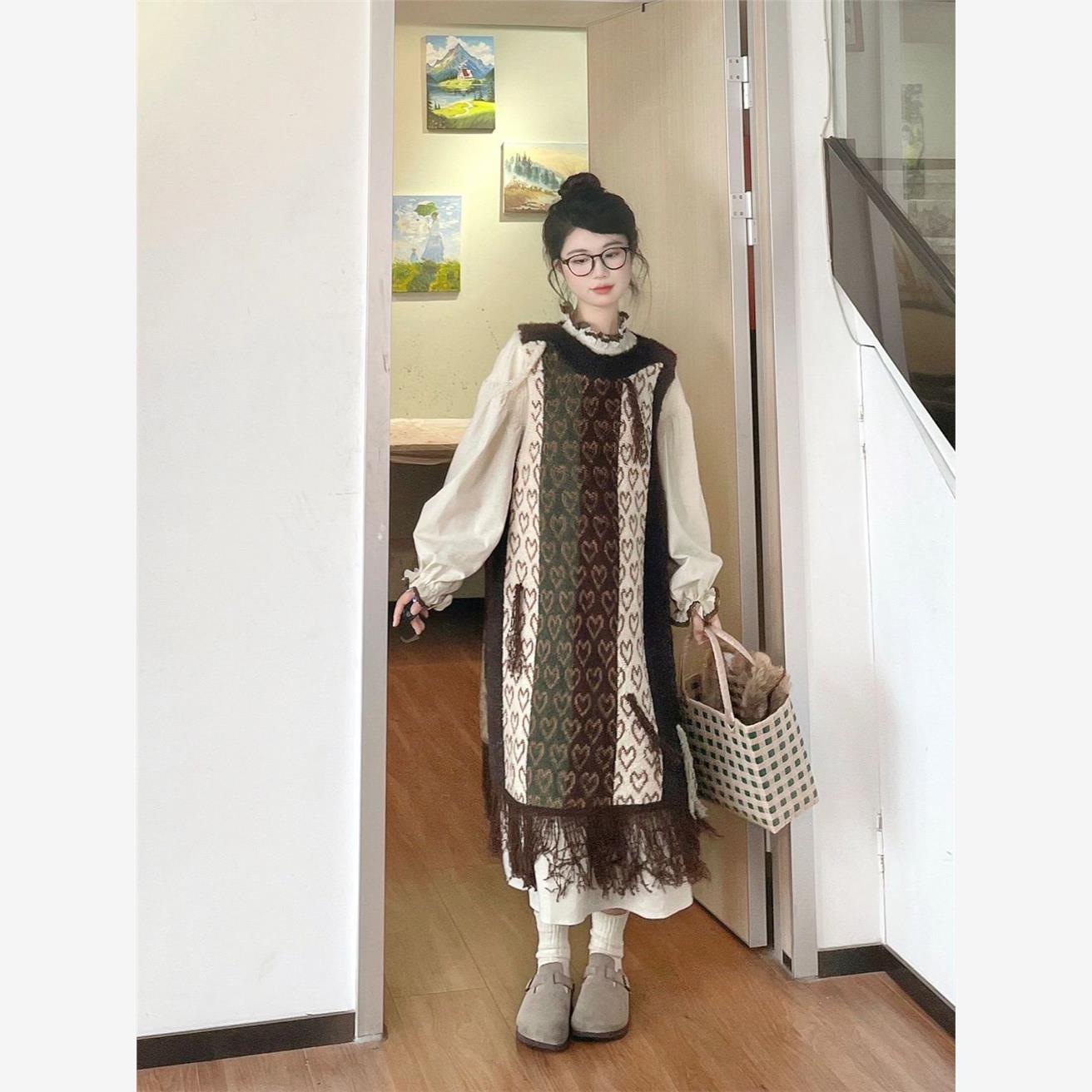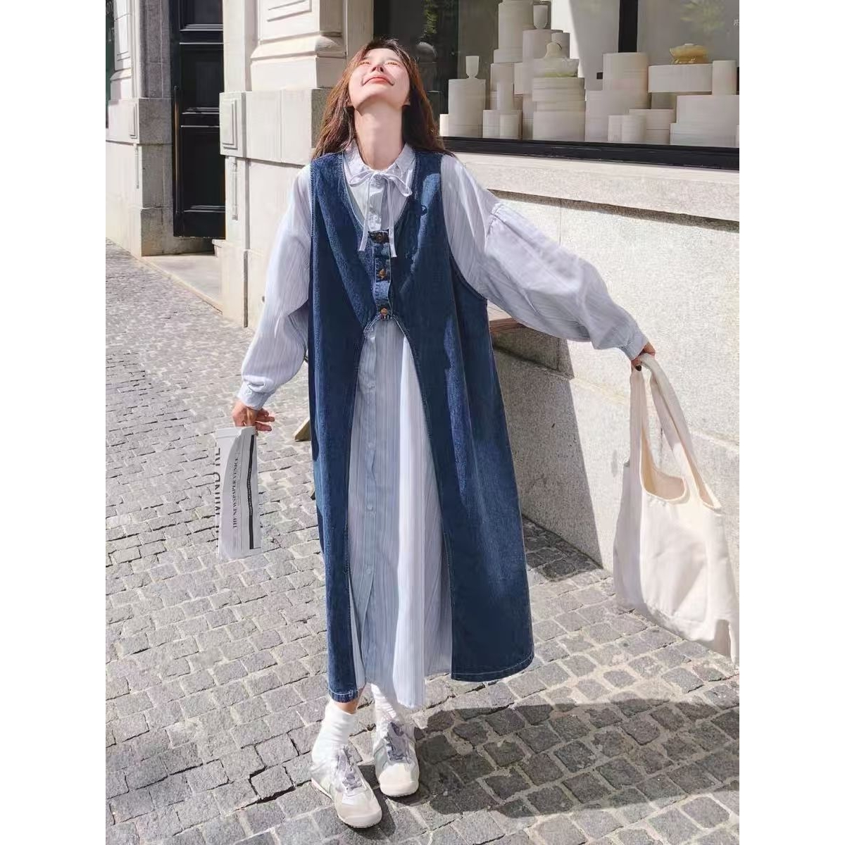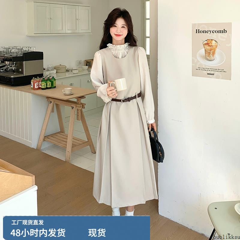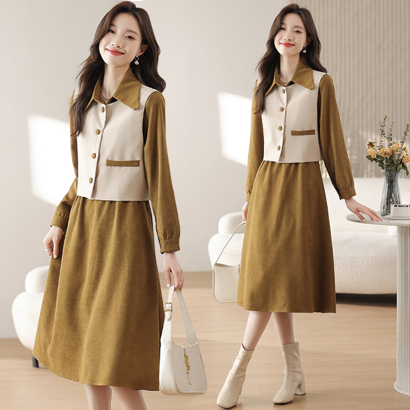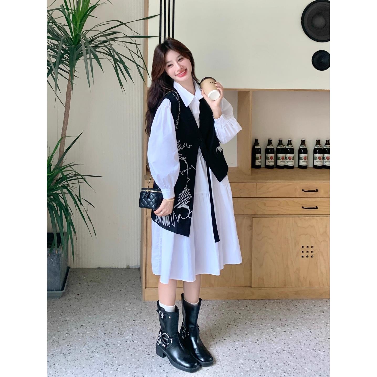 拉谷g折扣商场同款秋时尚韩版针织马甲背心衬衫裙两件套长连衣裙